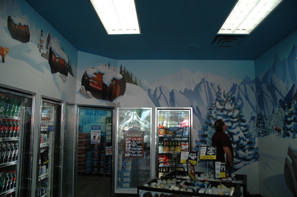 One of the unique challenges was the beer cooler, a 150 sq ft room which was covered from floor to ceiling with materials made to perform in a near-freezing environment, with high humidity as a consideration. SBR/Vision Graphics was able to quickly install the vinyl substrate, allowing Maverik to quickly return their beer cooler to online status.